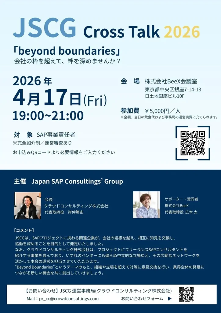 フリーランスSAPコンサルタントに特化した案件紹介事業を展開する、クラウドコンサルティング株式会社(本社:東京都港区 代表取締役:岸仲篤史)は、SAPプロジェクトに携わる関連企業のリーダー層を対象とした有志コミュニティ「JSCG」を発足いたしました。