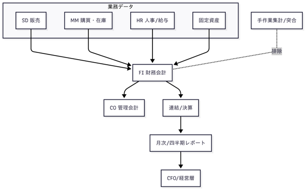 SAPの導入後は、販売・購買・人事などの情報が自動で財務会計(FI)に集約されるようになっています。