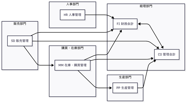 ・販売部門:SDで受注から請求までを一括管理。会計(FI)や在庫(MM)と連動。